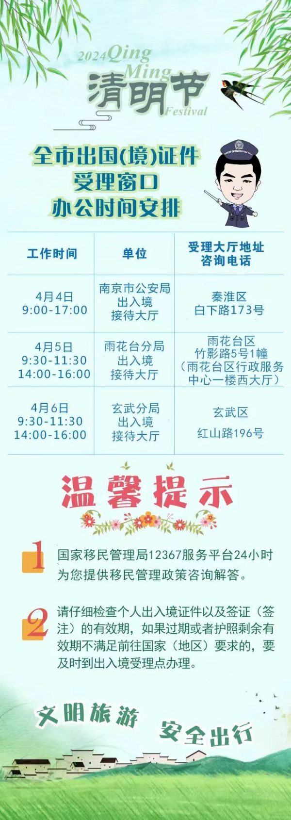 南京公安出入境2024年清明假期窗口对外办公时间表