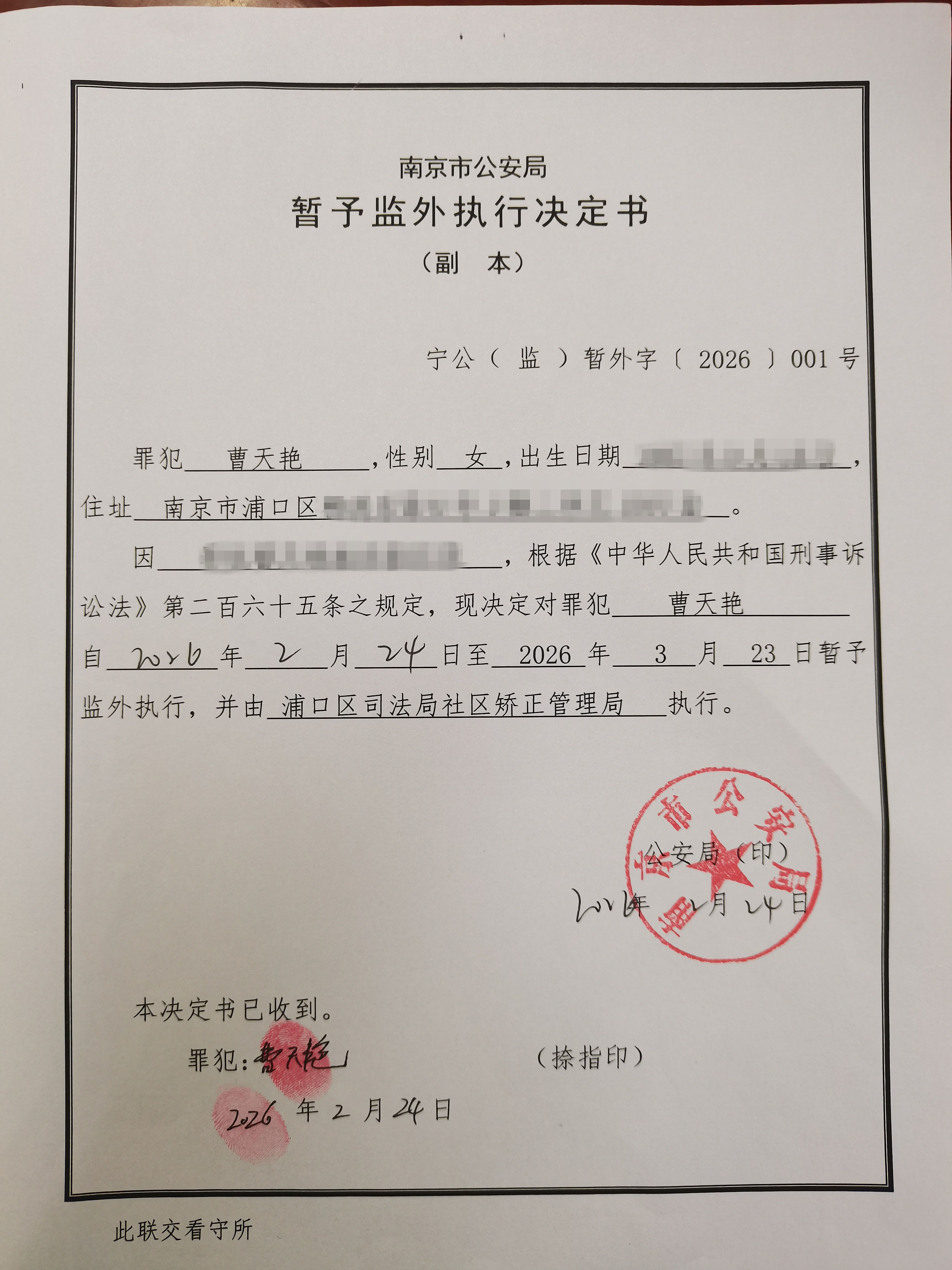 | 文 号: | 关 键 词: | 南京市公安局;暂予监外执行决定书;2026;001号 | |