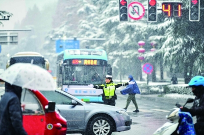 昨天,南京交警在各主要路段、路口采取定点执勤与铁骑流动巡逻相结合的方式,加大路面管控和指挥疏导力度,全力保障道路交通安全通畅。图为北京东路丹凤街路口交警冒雪指挥交通。