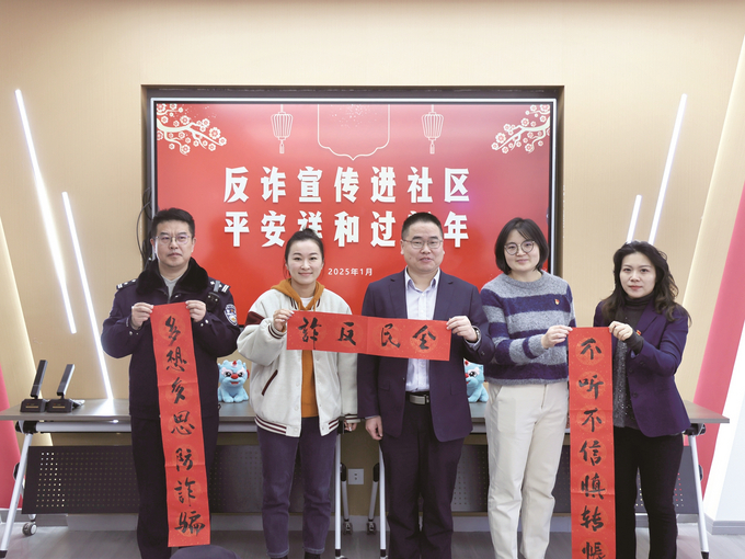近日,南京市公安局建邺分局兴隆派出所民警走进香山路社区,开展“反诈宣传进社区 平安祥和过春节”活动。活动中,民警创新宣传方式,现场带领居民书写反诈春联,宣讲反诈常识,筑起坚实的反诈防线,安心欢度新春佳节。